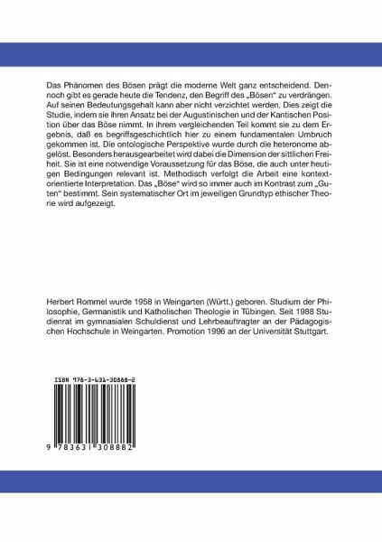 Das Phänomen des Bösen prägt die moderne Welt ganz entscheidend. Dennoch gibt es gerade heute die Tendenz, den Begriff des "Bösen" zu verdrängen. Auf seinen Bedeutungsgehalt kann aber nicht verzichtet werden. Dies zeigt die Studie, indem sie ihren Ansatz bei der Augustinischen und der Kantischen Position über das Böse nimmt. In ihrem vergleichenden Teil kommt sie zu dem Ergebnis, daß es begriffsgeschichtlich hier zu einem fundamentalen Umbruch gekommen ist. Die ontologische Perspektive wurde durch die heteronome abgelöst. Besonders herausgearbeitet wird dabei die Dimension der sittlichen Freiheit. Sie ist eine notwendige Voraussetzung für das Böse, die auch unter heutigen Bedingungen relevant ist. Methodisch verfolgt die Arbeit eine kontextorientierte Interpretation. Das "Böse" wird so immer auch im Kontrast zum "Guten" bestimmt. Sein systematischer Ort im jeweiligen Grundtyp ethischer Theorie wird aufgezeigt.