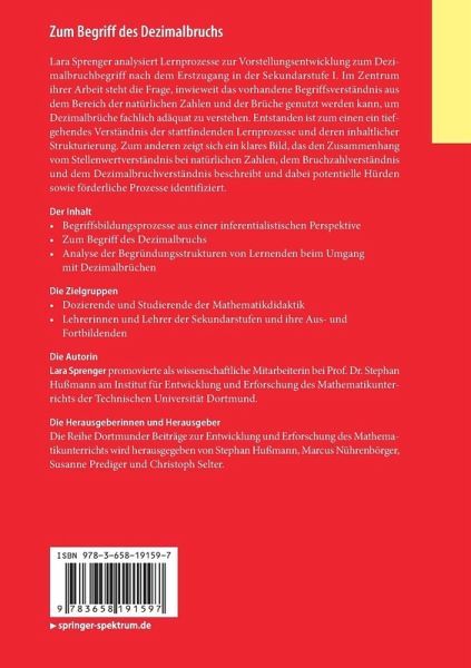 Lara Sprenger analysiert Lernprozesse zur Vorstellungsentwicklung zum Dezimalbruchbegriff nach dem Erstzugang in der Sekundarstufe I. Im Zentrum ihrer Arbeit steht die Frage, inwieweit das vorhandene Begriffsverständnis aus dem Bereich der natürlichen Zahlen und der Brüche genutzt werden kann, um Dezimalbrüche fachlich adäquat zu verstehen. Entstanden ist zum einen ein tiefgehendes Verständnis der stattfindenden Lernprozesse und deren inhaltlicher Strukturierung. Zum anderen zeigt sich ein klares Bild, das den Zusammenhang vom Stellenwertverständnis bei natürlichen Zahlen, dem Bruchzahlverständnis und dem Dezimalbruchverständnis beschreibt und dabei potentielle Hürden sowie förderliche Prozesse identifiziert.