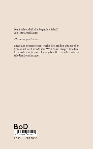 Das Buch enthält die folgenden Schriften von Immanuel Kant:-Zum ewigen FriedenEines der bekanntesten Werke des großen Philosophen Immanuel Kant wurde sein Werk "Zum ewigen Frieden". Er wurde damit zum Ideengeber für manch moderne Friedensbemühungen.