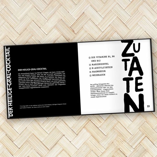 In diesem kleinen, quadratischen, quitschegelben Büchlein sind insgesamt 25 Cocktailrezepte versammelt. Wie jetzt? Nur 25 Rezepte, aber 148 Seiten? Ja – und ich sage euch: jede Seite ist ein (Trink-)Genuss! Neben den Rezepten gibt es viel Wissenswertes und Kurioses aus der Welt der Säufer und des Alkohols. Kleine Anekdoten, harte Fakten, witzige Zitate, Fußnoten zum Brüllen.