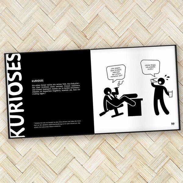 Innen ist das Buch komplett in schwarz/weiß gehalten. Es gibt keine Hochglanzfotos, sondern einfache, witzige und passende Illustrationen im Strichmännchendesign.