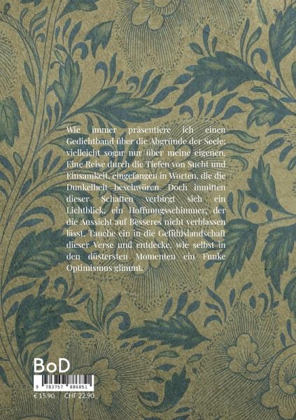 Wie immer präsentiere ich einen Gedichtband über die Abgründe der Seele; vielleicht sogar nur über meine eigenen. Eine Reise durch die Tiefen von Sucht und Einsamkeit, eingefangen in Worten, die die Dunkelheit beschwören. Doch inmitten dieser Schatten verbirgt sich ein Lichtblick, ein Hoffnungsschimmer, der die Aussicht auf Besseres nicht verblassen lässt. Tauche ein in die Gefühlslandschaft dieser Verse und entdecke, wie selbst in den düstersten Momenten ein Funke Optimismus glimmt.