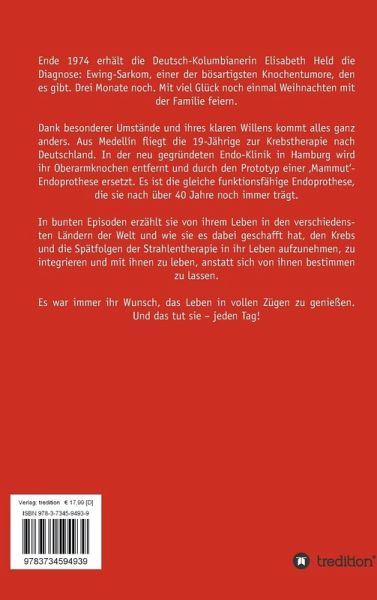 Ende 1974 erhält die Deutsch-Kolumbianerin Elisabeth Held die Diagnose: Ewing-Sarkom, einer der bösartigsten Knochentumore, den es gibt. Drei Monate noch. Mit viel Glück noch einmal Weihnachten mit der Familie feiern.Dank besonderer Umstände und ihres klaren Willens kommt alles ganz anders. Aus Medellín fliegt die 19-Jährige zur Krebstherapie nach Deutschland. In der neu gegründeten Endo-Klinik in Hamburg wird ihr Oberarmknochen entfernt und durch den Prototyp einer 'Mammut'-Endoprothese ersetzt. Es ist die gleiche funktionsfähige Endoprothese, die sie nach über 40 Jahre noch immer trägt. In bunten Episoden erzählt sie von ihrem Leben in den verschiedensten Ländern der Welt und wie sie es dabei geschafft hat, den Krebs und die Spätfolgen der Strahlentherapie in ihr Leben aufzunehmen, zu integrieren und mit ihnen zu leben, anstatt sich von ihnen bestimmen zu lassen. Es war immer ihr Wunsch, das Leben in vollen Zügen zu genießen. Und das tut sie - jeden Tag!