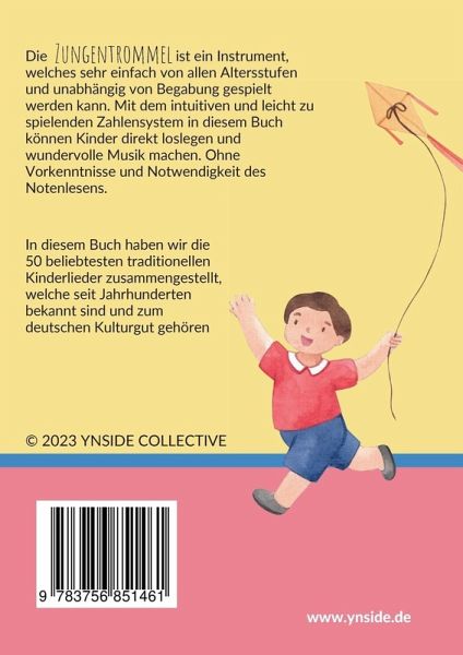 Zungentrommel Musikbuch: 50 Deutsche Kinderlieder - spielen nach Zahlen für diatonische Zungentrommeln (C-Dur) mit 8 / 11 / 14 / 15 Zungen - ohne Notenlesen.Die schönsten klassischen Kinderlieder aufbereitet für ein einfaches Spiel auf der Zungentrommel. Kein Notenlesen erforderlich!Das einfache Zungentrommel Tabular aus diesem Buch macht es absoluten Anfängern und Kindern einfach bereits nach wenigen Minuten ihr erstes Lied zu spielen - einfach nur indem man den Zahlen aus dem Buch folgt!Zusätzlich findest du in diesem Zungentrommel Liederbuch hilfreiche Tipps und Tricks zum spiel mit der Zungentrommel & Pflegehinweise. Dieses Liedbuch ist NICHT für pentatonische Zungentrommeln geeignet.1. Ihr Kinderlein kommet2. ABC, die Katze lief im Schnee3. Alle meine Entchen4. Alle Vögel sind schon da5. Auf der Mauer, auf der Lauer6. Auf einem Baum ein Kuckuck saß7. Backe, backe Kuchen8. Bruder Jakob9. Brüderchen, komm, tanz mit mir10. Bunt sind schon die Wälder11. Der Herbst ist da12. Der Kuckuck und der Esel13. Die Affen rasen durch den Wald14. Dornröschen war ein schönes Kind15. Drei Chinesen mit dem Kontrabass16. Männlein steht im Walde17. Eine Muh, eine Mäh18. Es regnet, es regnet19. Froh zu sein bedarf es wenig20. Es tanzt ein Bi-Ba-Butzemann21. Grün, grün, grün sind alle meine Kleider22. Hab 'ne Tante aus Marokko23. Hei, lustig, Ihr Kinder, vorbei ist der Winter24. Hejo, spann den Wagen an25. Kommt ein Vogel geflogen26. Hopp hopp hopp, Pferdchen lauf Galopp27. Ich bin ein Musikante28. Ich geh mit meiner Laterne29. Klein Häschen wollt' spazieren gehen30. Kling, Glöckchen, klingelingeling31. Lasst uns froh und munter sein32. Laterne, Laterne33. Liebe, liebe Sonne34. Mein Hut, der hat drei Ecken35. Meine Hände sind verschwunden36. Meine Oma fährt im Hühnerstall Motorrad37. Morgen, Kinder, wird's was geben38. O Tannenbaum39. Ri-ra-rutsch40. Ringel, Ringel, Reihe41. Sankt Martin ritt durch Schnee und Wind42. Schneeflöckchen, Weißröckchen43. Taler, Taler, du musst wandern44. Spannenlanger Hansel45. Weißt du, wie viel Sternlein stehen46. Wer will fleißige Handwerker sehn47. Widewidewenne48. Zehn kleine Zappelmänner49. Zeigt her eure Füße50. Zum Geburtstag viel Glück