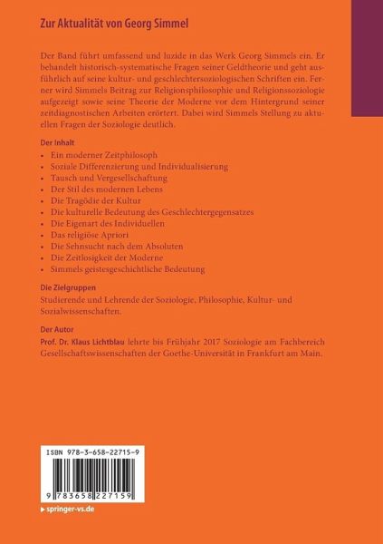 Der Band führt umfassend und luzide in das Werk Georg Simmels ein. Er behandelt historisch-systematische Fragen seiner Geldtheorie und geht ausführlich auf seine kultur- und geschlechtersoziologischen Schriften ein. Ferner wird Simmels Beitrag zur Religionsphilosophie und Religionssoziologie aufgezeigt sowie seine Theorie der Moderne vor dem Hintergrund seiner zeitdiagnostischen Arbeiten erörtert. Dabei wird Simmels Stellung zu aktuellen Fragen der Soziologie deutlich.