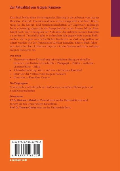 Das Buch bietet einenhervorragenden Einstieg in die Arbeiten von Jacques Rancière. ZentraleTheorieannahmen werden dargestellt und deren Bedeutung für die Kultur- und Sozialwissenschaftender Gegenwart aufgezeigt.