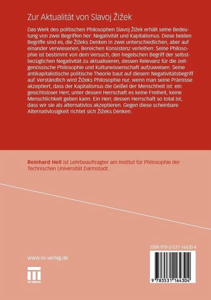 Das Werk des politischen Philosophen Slavoj Zizek erhält seine Bedeutung von zwei Begriffen her: Negativität und Kapitalismus. Diese beiden Begriffe sind es, die Zizeks Denken in zwei unterschiedlichen, aber auf einander verwiesenen, Bereichen Konsistenz verleihen: Seine Philosophie ist bestimmt von dem Versuch, den hegelschen Begriff der selbstbezüglichen Negativität zu aktualisieren, dessen Relevanz für die zeitgenössische Philosophie und Kulturwissenschaft aufzuweisen. Seine antikapitalistische politische Theorie baut auf diesem Negativitätsbegriff auf. Verständlich wird Zizeks Philosophie nur, wenn man seine Prämisse akzeptiert, dass der Kapitalismus die Geisel der Menschheit ist: ein gesichtsloser Herr, unter dessen Herrschaft es keine Freiheit, keine Menschlichkeit geben kann. Ein Herr, dessen Herrschaft so total ist, dass wir sie als alternativlos akzeptieren. Gegen diese scheinbare Alternativlosigkeit richtet sich Zizeks Denken.