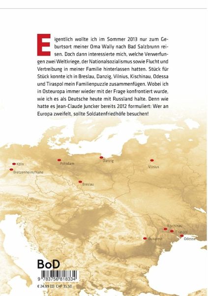 Eigentlich wollte ich im Sommer 2013 nur zum Geburtsort meiner Oma Wally nach Bad Salzbrunn reisen. Doch dann interessierte mich, welche Verwerfungen zwei Weltkriege, der Nationalsozialismus sowie Flucht und Vertreibung in meiner Familie hinterlassen hatten. Stück für Stück konnte ich in Breslau, Danzig, Vilnius, Kischinau, Odessa und Tiraspol mein Familienpuzzle zusammenfügen. Wobei ich in Osteuropa immer wieder mit der Frage konfrontiert wurde, wie ich es als Deutsche heute mit Russland halte. Denn wie hatte es Jean-Claude Juncker bereits 2012 formuliert: Wer an Europa zweifelt, sollte Soldatenfriedhöfe besuchen!
