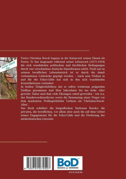 Pastor Christian Boeck begann in der Kaiserzeit seinen Dienst als Pastor. Er hat insgesamt während seiner Lebenszeit (1875-1964) die sich wandelnden politischen und kirchlichen Bedingungen durch vier verschiedene deutsche Staatsformen erlebt. Nicht nur in seinem beruflichen Lebensbereich ist er durch die damit verbundenen Umbrüche geprägt worden. - Auch sein Wirken in und für die Fehrs-Gilde hat sich in den sich wandelnden Konstellationen verändert.In beiden Tätigkeitsfeldern hat er selbst wiederum prägenden Einfluss genommen und über Jahrzehnte bis ins hohe Alter gewirkt. Dabei sind ihm viele Ehrungen zuteil geworden - wie u.a. das Bundesverdienstkreuz sowie die Benennung eines Weges vor dem markanten Wellingsbütteler Torhaus als 'Christian-Boeck-Allee'.Das Buch schildert die biografischen Stationen Boecks: die privaten, die beruflichen, vor allem aber auch die auf dem Gebiet seines Engagements für die Fehrs-Gilde und die Förderung der niederdeutschen Literatur.