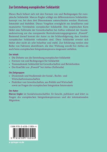 Dieses Buch befasst sich mit den Formen von und Bedingungen für europäische Solidarität. Marcus Engler schlägt ein differenzierteres Solidaritätskonzept vor, bei dem drei Dimensionen unterschieden werden: Horizont, Intensität und Stabilität. Dieses Vorgehen ermöglicht ein detailliertes und nuanciertes Verständnis europäischer Solidarität. Den empirischen Kern bildet eine Fallstudie der Gewerkschaften bei Airbus während der Auseinandersetzung um das europaweite Restrukturierungsprogramm "Power8". Basierend darauf kommt der Autor zu der Schlussfolgerung, dass Ansätze europäischer Solidarität vorhanden sind. Diese Solidarität erweist sich bisher aber nicht als sehr belastbar und stabil. Zur Erklärung werden eine Reihe von Faktoren identifiziert, die ihre Wirkung sowohl bei Airbus als auch beim europäischen Integrationsprozess insgesamt entfalten.