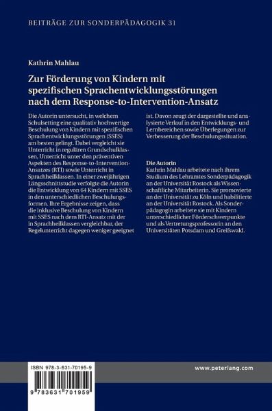 Die Autorin untersucht, in welchem Schulsetting eine qualitativ hochwertige Beschulung von Kindern mit spezifischen Sprachentwicklungsstörungen (SSES) am besten gelingt. Dabei vergleicht sie Unterricht in regulären Grundschulklassen, Unterricht unter den präventiven Aspekten des Response-to-Intervention-Ansatzes (RTI) sowie Unterricht in Sprachheilklassen. In einer zweijährigen Längsschnittstudie verfolgte die Autorin die Entwicklung von 64 Kindern mit SSES in den unterschiedlichen Beschulungsformen. Ihre Ergebnisse zeigen, dass die inklusive Beschulung von Kindern mit SSES nach dem RTI-Ansatz mit der in Sprachheilklassen vergleichbar, der Regelunterricht dagegen weniger geeignet ist. Davon zeugen der dargestellte und analysierte Verlauf in den Entwicklungs- und Lernbereichen sowie Überlegungen zur Verbesserung der Beschulungssituation.
