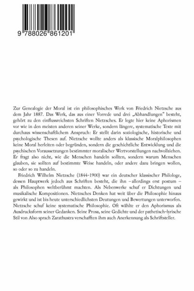 Zur Genealogie der Moral ist ein philosophisches Werk von Friedrich Nietzsche aus dem Jahr 1887. Das Werk, das aus einer Vorrede und drei "Abhandlungen" besteht, gehört zu den einflussreichsten Schriften Nietzsches. Er legte hier keine Aphorismen vor wie in den meisten anderen seiner Werke, sondern längere, systematische Texte mit durchaus wissenschaftlichem Anspruch: Er stellt darin soziologische, historische und psychologische Thesen auf. Nietzsche wollte anders als klassische Moralphilosophen keine Moral herleiten oder begründen, sondern die geschichtliche Entwicklung und die psychischen Voraussetzungen bestimmter moralischer Wertvorstellungen nachvollziehen. Er fragt also nicht, wie die Menschen handeln sollten, sondern warum Menschen glauben, sie sollten auf bestimmte Weise handeln, oder andere dazu bringen wollen, so oder so zu handeln. Friedrich Wilhelm Nietzsche (1844-1900) war ein deutscher klassischer Philologe, dessen Hauptwerk jedoch aus Schriften besteht, die ihn - allerdings erst postum - als Philosophen weltberühmt machten. Als Nebenwerke schuf er Dichtungen und musikalische Kompositionen. Nietzsches Denken hat weit über die Philosophie hinaus gewirkt und ist bis heute unterschiedlichsten Deutungen und Bewertungen unterworfen. Nietzsche schuf keine systematische Philosophie. Oft wählte er den Aphorismus als Ausdrucksform seiner Gedanken. Seine Prosa, seine Gedichte und der pathetisch-lyrische Stil von Also sprach Zarathustra verschafften ihm auch Anerkennung als Schriftsteller.