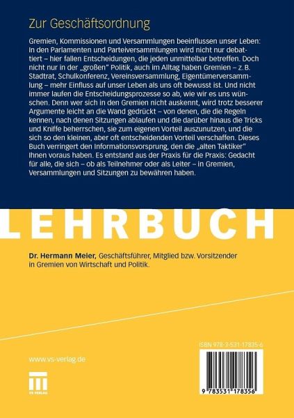 Gremien, Kommissionen und Versammlungen beeinflussen unser Leben: In den Parlamenten und Parteiversammlungen wird nicht nur debattiert - hier fallen Entscheidungen, die jeden unmittelbar betreffen. Doch nicht nur in der "großen" Politik, auch im Alltag haben Gremien - z.B. Stadtrat, Schulkonferenz, Vereinsversammlung, Eigentümerversammlung - mehr Einfluss auf unser Leben als uns oft bewusst ist. Und nicht immer laufen die Entscheidungsprozesse so ab, wie wir es uns wünschen. Denn wer sich in den Gremien nicht auskennt, wird trotz besserer Argumente leicht an die Wand gedrückt - von denen, die die Regeln kennen, nach denen Sitzungen ablaufen und die darüber hinaus die Tricks und Kniffe beherrschen, sie zum eigenen Vorteil auszunutzen, und die sich so den kleinen, aber oft entscheidenden Vorteil verschaffen. Dieses Buch verringert den Informationsvorsprung, den die "alten Taktiker" Ihnen voraus haben. Es entstand aus der Praxis für die Praxis: Gedacht für alle, die sich - ob als Teilnehmer oder als Leiter - in Gremien, Versammlungen und Sitzungen zu bewähren haben.