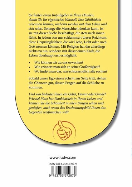 ie halten einen Impulsgeber in Ihren Händen, damit Sie Ihr eigentliches Naturell, Ihre Göttlichkeit erkennen können, und eins werden mit dem Leben und sich selbst. Solange die Menschheit denken kann, ist sie mit dieser Suche beschäftigt, die stets nach innen führt. In jedem von uns schlummert dieser Reichtum, diese Ursprünglichkeit, die wir Liebe, Licht oder auch Gott nennen können. Mit Religion hat das allerdings nichts zu tun, sondern mit dieser einen Kraft, die Leben überhaupt erst ermöglicht.Wie können wir zu uns erwachen? Wie erinnert man sich an seine Großartigkeit? Wo findet man das, was schlussendlich alle suchen? Sobald unser Ego einen Schritt zur Seite tritt, stehen die Chancen gut, diesen Fragen auf die Schliche zu kommen.Und was bedeutet Ihnen ein Gebet, Demut oder Gnade? Wieviel Platz hat Dankbarkeit in Ihrem Leben und können Sie die Schönheit in allen Dingen sehen und genießen, auch wenn das Erscheinungsbild Ihnen das Gegenteil weißmachen will?