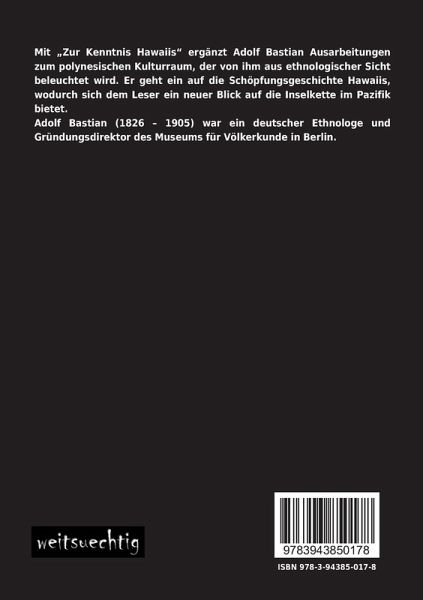 Mit Zur Kenntnis Hawaiis ergänzt Adolf Bastian Ausarbeitungen zum polynesischen Kulturraum, der von ihm aus ethnologischer Sicht beleuchtet wird. Er geht ein auf die Schöpfungsgeschichte Hawaiis, wodurch sich dem Leser ein neuer Blick auf die Inselkette im Pazifik bietet.