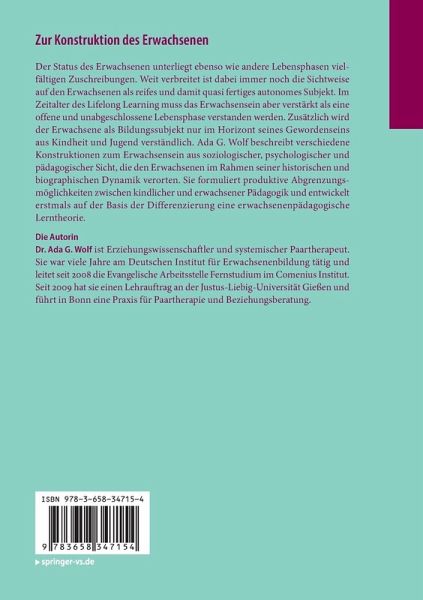 Der Status des Erwachsenen unterliegt ebenso wie andere Lebensphasen vielfältigen Zuschreibungen. Weit verbreitet ist dabei immer noch die Sichtweise auf den Erwachsenen als reifes und damit quasi fertiges autonomes Subjekt. Im Zeitalter des Lifelong Learning muss das Erwachsensein aber verstärkt als eine offene und unabgeschlossene Lebensphase verstanden werden. Zusätzlich wird der Erwachsene als Bildungssubjekt nur im Horizont seines Gewordenseins aus Kindheit und Jugend verständlich. Ada G. Wolf beschreibt verschiedene Konstruktionen zum Erwachsensein aus soziologischer, psychologischer und pädagogischer Sicht, die den Erwachsenen im Rahmen seiner historischen und biographischen Dynamik verorten. Sie formuliert produktive Abgrenzungsmöglichkeiten zwischen kindlicher und erwachsener Pädagogik und entwickelt erstmals auf der Basis der Differenzierung eine erwachsenenpädagogische Lerntheorie.