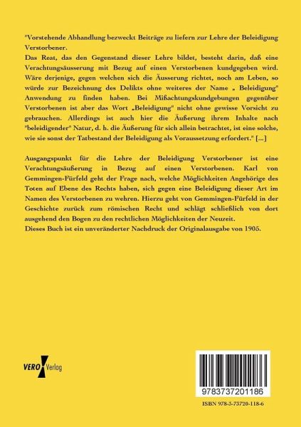 Ausgangspunkt für die Lehre der Beleidigung Verstorbener ist eine Verachtungsäußerung in Bezug auf einen Verstorbenen. Karl von Gemmingen-Fürfeld geht der Frage nach, welche Möglichkeiten Angehörige des Toten auf Ebene desRechts haben, sich gegen eine Beleidigung dieser Art im Namen des Verstorbenen zu wehren. Hierzu geht von Gemmingen-Fürfeld in der Geschichte zurück zum römischen Recht und schlägt schließlich von dort ausgehend den Bogen zu den rechtlichen Möglichkeiten der Neuzeit.