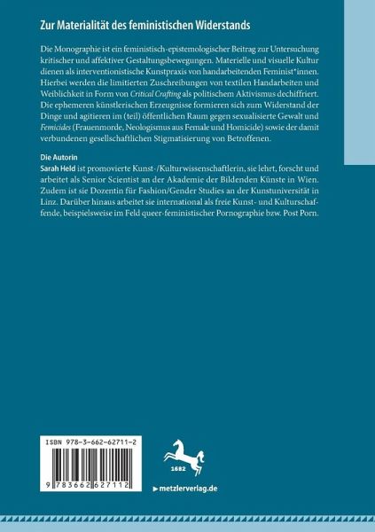 Die Monographie ist ein feministisch-epistemologischer Beitrag zur Untersuchung kritischer und affektiver Gestaltungsbewegungen. Materielle und visuelle Kultur dienen als interventionistische Kunstpraxis von handarbeitenden Feminist_innen. Hierbei werden die limitierten Zuschreibungen von textilen Handarbeiten und Weiblichkeit in Form von Critical Crafting als politischem Aktivismus dechiffriert. Die ephemeren künstlerischen Erzeugnisse formieren sich zum Widerstand der Dinge und agitieren im (teil) öffentlichen Raum gegen sexualisierte Gewalt und Femicides (Frauenmorde, Neologismus aus Female und Homicide) sowie der damit verbundenen gesellschaftlichen Stigmatisierung von Betroffenen.