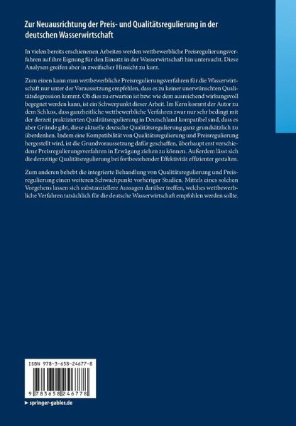 Zum einen kann man wettbewerbliche Preisregulierungsverfahren für die Wasserwirtschaft nur unter der Voraussetzung empfehlen, dass es zu keiner unerwünschten Qualitätsdegression kommt. Ob dies zu erwarten ist bzw. wie dem ausreichend wirkungsvoll begegnet werden kann, ist ein Schwerpunkt dieser Arbeit. Im Kern kommt der Autor zu dem Schluss, dass ganzheitliche wettbewerbliche Verfahren zwar nur sehr bedingt mit der derzeit praktizierten Qualitätsregulierung in Deutschland kompatibel sind, dass es aber Gründe gibt, diese aktuelle deutsche Qualitätsregulierung ganz grundsätzlich zu überdenken. Indem eine Kompatibilität von Qualitätsregulierung und Preisregulierung hergestellt wird, ist die Grundvoraussetzung dafür geschaffen, überhaupt erst verschiedene Preisregulierungsverfahren in Erwägung ziehen zu können. Außerdem lässt sich die derzeitige Qualitätsregulierung bei fortbestehender Effektivität effizienter gestalten.
