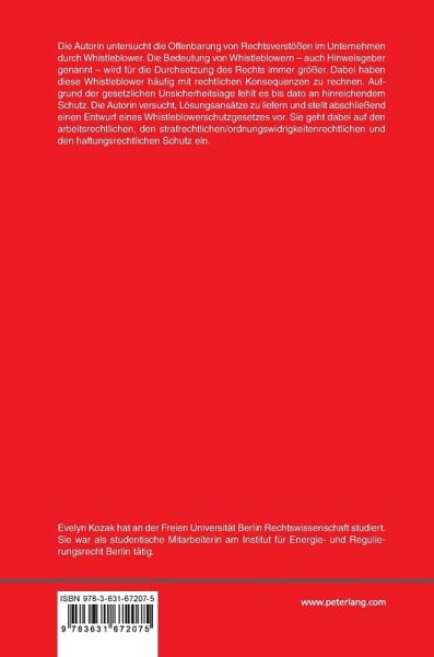 Die Autorin untersucht die Offenbarung von Rechtsverstößen im Unternehmen durch Whistleblower. Die Bedeutung von Whistleblowern - auch Hinweisgeber genannt - wird für die Durchsetzung des Rechts immer größer. Dabei haben diese Whistleblower häufig mit rechtlichen Konsequenzen zu rechnen. Aufgrund der gesetzlichen Unsicherheitslage fehlt es bis dato an hinreichendem Schutz. Die Autorin versucht, Lösungsansätze zu liefern und stellt abschließend einen Entwurf eines Whistleblowerschutzgesetzes vor. Sie geht dabei auf den arbeitsrechtlichen, den strafrechtlichen/ordnungswidrigkeitenrechtlichen und den haftungsrechtlichen Schutz ein.