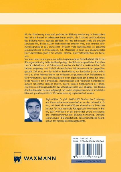 In dieser Untersuchung wird nach dem Zugewinn dieser Individualdaten für das Bildungsmonitoring in Deutschland gefragt. Am Beispiel ausgewählter Schulstatistiken zum Schulabschluss und Schulabbruch werden die Defizite herkömmlicher Indikatoren aufgezeigt und individualstatistischen Indikatorenansätzen gegenübergestellt. Ziel ist es, von der üblichen Beschreibung von Zuständen ('stock indicators') zu einer Rekonstruktion von Verläufen zu gelangen ('flow indicators'). Es wird verdeutlicht, dass die Individualstatistik einen eigenständigen Beitrag für vertiefende Analysen der individuellen, institutionellen und regionalen Kontextbedingungen schulischer Bildungsprozesse leistet. Abschließend werden Möglichkeiten der Rekonstruktion von Bildungsverläufen der Schulabsolventen und -abgänger am Beispiel des Bundeslandes Hessen aufgezeigt, wo in den vergangenen Jahren Schulstatistiken mit pseudonymisierter Personenkennung implementiert wurden.