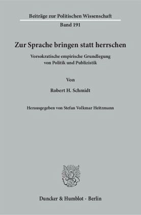 "Während es zwar seit rund zweieinhalbtausend Jahren viele hundert mehr oder weniger gewichtige Theorien über Politik gibt, von Sokrates/Plato die ganze Philosophiegeschichte hindurch, bis Hegel, Marx und Habermas, habe ich den Versuch gemacht, empirisch, kombiniert auf drei Wegen (mittels früher historischer Darstellungen, mittels Vor- und Frühgeschichte und aus dem indogermanischen einschlägigen Sprachmaterial) zu einer Grundlegung des Politischen aus sich heraus zu kommen, unabhängig von jeder Theorie. [...] Ergebnis ist eine - wie sich zeigte - Grundlegung der an ihrer Basis miteinander verbundenen Politik u n d Publizistik. Dazu bringe ich (am Beispiel der historischen Entwicklung von den fränkischen Stämmen des 1. Jh. n. Chr. über das merowingische Frankenreich, das karolingische Franken-Langobarden-Reich, das mittelalterliche Sacrum Imperium bis zu dessen neuzeitlichen staatlichen Nachfolgegebilden in Italien, Deutschland und Frankreich), wie mit dem Verlust der spezifischpolitischen Merkmale der Gemeinwesen Freie zu Untertanen werden." Robert H. Schmidt