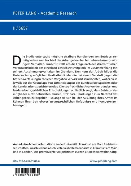 Die Studie untersucht mögliche strafbare Handlungen von Betriebsratsmitgliedern zum Nachteil des Arbeitgebers bei betriebsverfassungswidrigem Verhalten. Zunächst stellt sich die Frage nach der strafrechtlichen Verantwortlichkeit des einzelnen Betriebsratsmitglieds im Zusammenhang mit seinem Abstimmungsverhalten im Gremium. Den Kern der Arbeit bildet die Untersuchung möglicher Straftatbestände, die bei einem Verstoß gegen die betriebsverfassungsrechtlichen Vorgaben verwirklicht sein könnten, wobei diese jeweils auf der Grundlage von Entscheidungen des Bundesarbeitsgerichts oder der Landesarbeitsgerichte erfolgt. Die strafrechtliche Analyse der bundes- und landesarbeitsgerichtlichen Entscheidungen schließlich zeigt, dass Betriebsratsmitglieder nicht befürchten müssen, strafbare Handlungen zum Nachteil des Arbeitgebers zu begehen - solange sie sich bei der Ausübung ihres Amtes im Rahmen ihrer betriebsverfassungsrechtlichen Befugnisse und Kompetenzen bewegen.