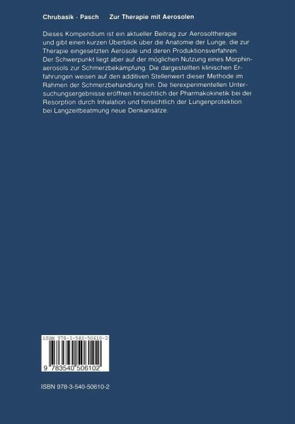 Dieses Kompendium ist ein aktueller Beitrag zur Aerosoltherapie und gibt einen kurzen Überblick über die Anatomie der Lunge, die zur Therapie eingesetzten Aerosole und deren Produktionsverfahren. Der Schwerpunkt liegt aber auf der möglichen Nutzung eines Morphinaerosols zur Schmerzbekämpfung. Die dargestellten klinischen Erfahrungen weisen nur auf den additiven Stellenwert dieser Methode im Rahmen der Schmerzbehandlung hin. Die tierexperimentellen Untersuchungsergebnisse ermöglichen dagegen hinsichtlich der Pharmakokinetik bei der Resorption durch Inhalation und hinsichtlich der Lungenprotektion bei Langzeitbeatmung neue Ansätze.