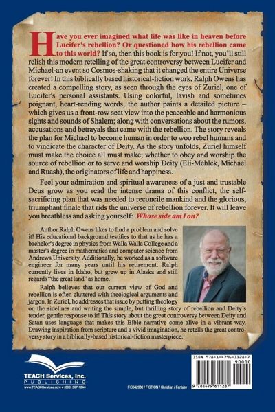 Have you ever imagined what life was like in heaven before Lucifer's rebellion? Or questioned how his rebellion came to this world? If so, then this book is for you! If not, you'll still relish this modern retelling of the great controversy between Lucifer and Michael-an event so Cosmos-shaking that it changed the entire Universe forever! In this biblically based historical-fiction work, Ralph Owens has created a compelling story, as seen through the eyes of Zuriel, one of Lucifer's personal assistants. Using colorful, lavish and sometimes poignant, heart-rending words, the author paints a detailed picture - which gives us a front-row seat view into the peaceable and harmonious sights and sounds of Shalem; along with conversations about the rumors, accusations and betrayals that came with the rebellion. The story reveals the plan for Michael to become human in order to woo rebel humans and to vindicate the character of Deity. As the story unfolds, Zuriel himself must make the choice all must make; whether to obey and worship the source of rebellion or to serve and worship Deity (Eli-Mehlek, Michael and Ruash), the originators of life and happiness. Feel your admiration and spiritual awareness of a just and trustable Deus grow as you read the intense drama of this conflict, the self-sacrificing plan that was needed to reconcile mankind and the glorious, triumphant finale that rids the universe of rebellion forever. It will leave you breathless and asking yourself: Whose side am I on?