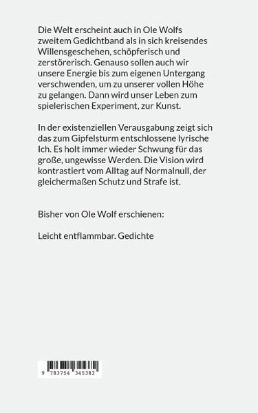 Die Welt erscheint auch in Ole Wolfs zweitem Gedichtband als in sich kreisendes Willensgeschehen, schöpferisch und zerstörerisch. Genauso sollen auch wir unsere Energie bis zum eigenen Untergang verschwenden, um zu unserer vollen Höhe zu gelangen. Dann wird unser Leben zum spielerischen Experiment, zur Kunst.In der existenziellen Verausgabung zeigt sich das zum Gipfelsturm entschlossene lyrische Ich. Es holt immer wieder Schwung für das große, ungewisse Werden. Die Vision wird kontrastiert vom Alltag auf Normalnull, der gleichermaßen Schutz und Strafe ist.Dieses Buch gehört zum Gesamtwerk von Ole Wolf, das als Sammelband mit dem Titel "Du musst dein Leben steigern" gebündelt erhältlich ist.