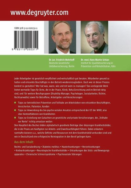 Unfälle und Krankheiten verändern oft das Leben von Menschen! Auf dem Weg zurück in den Beruf brauchen dann Beschäftigte die eigene Motivation, unterstützende Vorgesetzte und Kollegen, aktive Versicherungen und Ärzte mit dem Wissen, wie Patienten nicht nur gesund, sondern auch wieder arbeitsfähig werden. Alle Beteiligten, einschließlich weiterer Experten, wie etwa Disability Manager, müssen die hindernden Steine aus dem Weg räumen, was oft nur miteinander gelingt. Dieses Buch unterstützt darin die Fachleute sowohl in der Prävention, die Haus- und Fachärzte sowie die Experten in der Rehabilitation. Es liefert die gesammelten Erkenntnisse von Autoren, die als Fachärzte einerseits die häufigsten Krankheiten der Beschäftigten behandeln und andererseits die betrieblichen Besonderheiten kennen und bei allem die rechtlichen Grenzen beachten, aber auch deren Möglichkeiten ausschöpfen. Von dem neuen und einmaligen Nachschlagewerk sollen die Ärzte untereinander profitieren, die Versicherungen voneinander lernen, die betriebliche Akteure zueinander finden und die zahlreichen Experten zum Miteinander angeregt werden - zum Wohle der Menschen, die nicht schon in jungen Jahren abhängig von finanzieller Hilfe anderer werden wollen. Die Berücksichtigung biopsychosozialer Einflüsse und die Orientierung an verbleibenden Fähigkeiten (ICF) bilden das Herzstück des Ratgebers, der sicher auch die sozialmedizinische Begutachtung beeinflussen wird.