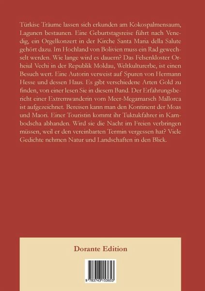 Türkise Träume lassen sich erkunden am Kokospalmensaum, Lagunen bestaunen. Eine Geburtstagsreise führt nach Venedig, ein Orgelkonzert in der Kirche Santa Maria della Salute gehört dazu. Im Hochland von Bolivien muss ein Rad gewechselt werden. Wie lange wird es dauern? Das Felsenkloster Orheiul Vechi in der Republik Moldau, Weltkulturerbe, ist einen Besuch wert. Eine Autorin verweist auf Spuren von Hermann Hesse und dessen Haus. Es gibt verschiedene Arten Gold zu finden, von einer lesen Sie in diesem Band. Der Erfahrungsbericht einer Extremwanderin vom Meer-Megamarsch Mallorca ist aufgezeichnet. Bereisen kann man den Kontinent der Moas und Maori. Einer Touristin kommt ihr Tuktukfahrer in Kambodscha abhanden. Wird sie die Nacht im Freien verbringen müssen, weil er den vereinbarten Termin vergessen hat? Viele Gedichte nehmen Natur und Landschaften in den Blick.