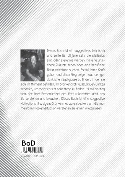Dieses Buch ist ein suggestives Lehrbuch und sollte für all jene sein, die stellenlos sind oder stellenlos werden. Die eine unsichere Zukunft sehen oder eine berufliche Neuausrichtung suchen. Es soll ihnen Kraft geben und einen Weg zeigen, aus der gedanklichen Sackgasse zu finden, in der sie sich im Moment befinden. Ihr Stärkenprofil auszubauen und zu schärfen, um zielorientiert neue Wege zu finden. Es soll ein Weg sein, der ihrer Persönlichkeit den Wert zukommen lässt, den Sie verdienen und brauchen. Dieses Buch ist eine suggestive Motivationshilfe, eigene Stärken neu zu entdecken, um die momentane Problemsituation verstehen zu lernen wie zu lösen.