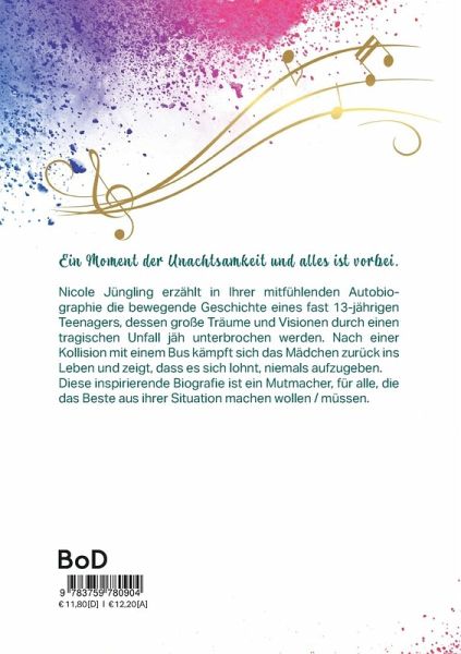 Ein Moment der Unachtsamkeit und alles ist vorbei. Nicole Jüngling erzählt in Ihrer mitfühlenden Autobiographie die bewegende Geschichte eines fast 13-jährigen Teenagers, dessen große Träume und Visionen durch einen tragischen Unfall jäh unterbrochen werden. Nach einer Kollision mit einem Bus kämpft sich das Mädchen zurück ins Leben und zeigt, dass es sich lohnt, niemals aufzugeben. Diese inspirierende Biografie ist ein Mutmacher, für alle, die das Beste aus ihrer Situation machen wollen / müssen.