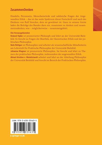 Roland Kipke ist promovierter Philosoph und lehrt an der Universität Bielefeld. Er forscht zu Fragen der Bioethik, der theoretischen Ethik und der politischen Philosophie. Nele Röttger ist Philosophin und arbeitet als wissenschaftliche Mitarbeiterin am Lehrstuhl für Praktische Philosophie der Universität Bielefeld. Johanna Wagner ist promovierte Philosophin. Sie forscht und lehrt zu Themen der praktischen Philosophie, insbesondere der angewandten Ethik. Almut Kristine v. Wedelstaedt arbeitet und lehrt an der Abteilung Philosophie der Universität Bielefeld und forscht im Bereich der Praktischen Philosophie.