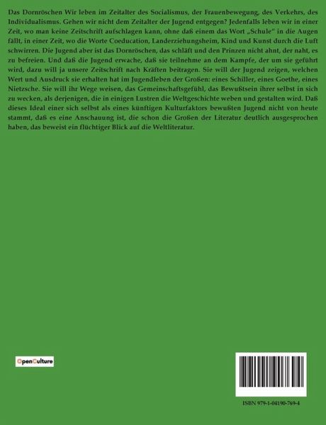 Das Dornröschen Wir leben im Zeitalter des Socialismus, der Frauenbewegung, des Verkehrs, des Individualismus. Gehen wir nicht dem Zeitalter der Jugend entgegen? Jedenfalls leben wir in einer Zeit, wo man keine Zeitschrift aufschlagen kann, ohne daß einem das Wort ¿Schule¿ in die Augen fällt, in einer Zeit, wo die Worte Coeducation, Landerziehungsheim, Kind und Kunst durch die Luft schwirren. Die Jugend aber ist das Dornröschen, das schläft und den Prinzen nicht ahnt, der naht, es zu befreien. Und daß die Jugend erwache, daß sie teilnehme an dem Kampfe, der um sie geführt wird, dazu will ja unsere Zeitschrift nach Kräften beitragen. Sie will der Jugend zeigen, welchen Wert und Ausdruck sie erhalten hat im Jugendleben der Großen: eines Schiller, eines Goethe, eines Nietzsche. Sie will ihr Wege weisen, das Gemeinschaftsgefühl, das Bewußtsein ihrer selbst in sich zu wecken, als derjenigen, die in einigen Lustren die Weltgeschichte weben und gestalten wird. Daß dieses Ideal einer sich selbst als eines künftigen Kulturfaktors bewußten Jugend nicht von heute stammt, daß es eine Anschauung ist, die schon die Großen der Literatur deutlich ausgesprochen haben, das beweist ein flüchtiger Blick auf die Weltliteratur.