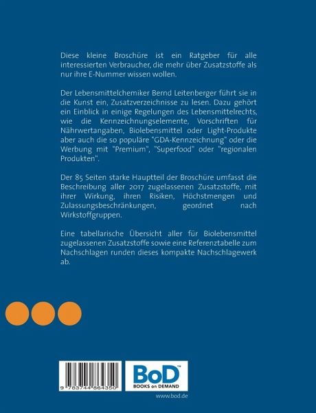 Diese kleine Broschüre ist ein Ratgeber für alle interessierten Verbraucher, die mehr über Zusatzstoffe als nur ihre E-Nummer wissen wollen.Der Lebensmittelchemiker Bernd Leitenberger führt sie in die Kunst ein, Zusatzverzeichnisse zu lesen. Dazu gehört ein Einblick in einige Regelungen des Lebensmittelrechts, wie die Kennzeichnungselemente, Vorschriften für Nährwertangaben, Biolebensmittel oder Light-Produkte, aber auch die so populäre "GDA-Kennzeichnung" oder die Werbung mit "Premium", "Superfood" oder "regionalen Produkten".Der 85 Seiten starke Hauptteil der Broschüre umfasst die Beschreibung aller 2017 zugelassenen Zusatzstoffe, mit ihrer Wirkung, ihren Risiken, Höchstmengen und Zulassungsbeschränkungen, geordnet nach Wirkstoffgruppen. Eine tabellarische Übersicht aller für Biolebensmittel zugelassenen Zusatzstoffe sowie eine Referenztabelle zum Nachschlagen runden dieses kompakte Nachschlagewerk ab.