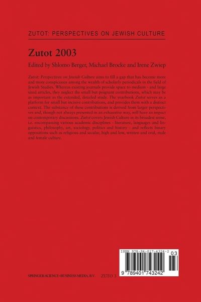 Zutot: Perspectives on Jewish Culture aims to fill a gap that has become more and more conspicuous among the wealth of scholarly periodicals in the field of Jewish Studies. Whereas existing journals provide space to medium - and large sized articles, they neglect the small but poignant contributions, which may be as important as the extended, detailed study. The yearbook Zutot serves as a platform for small but incisive contributions, and provides them with a distinct context. The substance of these contributions is derived from larger perspectives and, though not always presented in an exhaustive way, will have an impact on contemporary discussions. Zutot covers Jewish Culture in its broadest sense, i.e. encompassing various academic disciplines - literature, languages and linguistics, philosophy, art, sociology, politics and history - and reflects binary oppositions such as religious and secular, high and low, written and oral, male and female culture.
