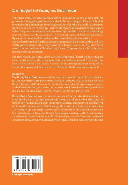 Von immer komplexer werdenden technischen Produkten erwartet man heute nicht nur gesteigerte Leistungsfähigkeit, sondern auch erhöhte Zuverlässigkeit. Dieses Lehrbuch ist sowohl eine Einführung in die Zuverlässigkeitstheorie für Fahrzeug- und Maschinenbauingenieure als auch ein Nachschlage- und Vertiefungswerk für Zuverlässigkeitsspezialisten. Neben den praxisrelevanten statistischen Grundlagen und den qualitativen Zuverlässigkeitsmethoden wie der FMEA und der FTA befasst sich dieses Lehrbuch schwerpunktmäßig mit der Lebensdauerdatenanalyse und den Zuverlässigkeitstestmethoden.
