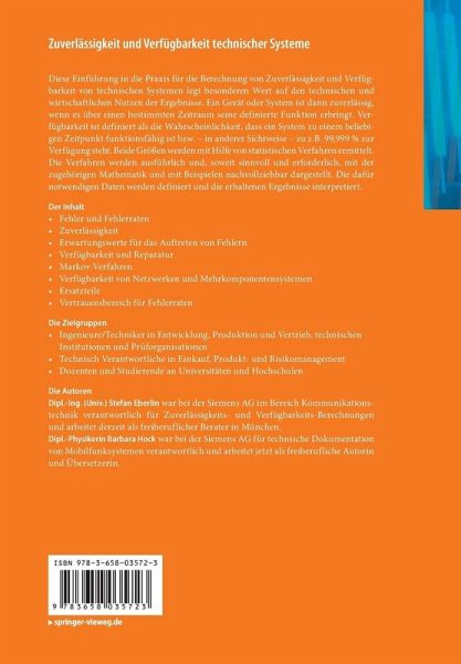 Diese Einführung in die Praxis für die Berechnung von Zuverlässigkeit und Verfügbarkeit von technischen Systemen legt besonderen Wert auf den technischen und wirtschaftlichen Nutzen der Ergebnisse. Ein Gerät oder System ist dann zuverlässig, wenn es über einen bestimmten Zeitraum seine definierte Funktion erbringt. Verfügbarkeit ist definiert als die Wahrscheinlichkeit, dass ein System zu einem beliebigen Zeitpunkt funktionsfähig ist bzw. - in anderer Sichtweise - zu z.B. 99,999 % zur Verfügung steht. Beide Größen werden mit Hilfe von statistischen Verfahren ermittelt. Die Verfahren werden ausführlich und, soweit sinnvoll und erforderlich, mit der zugehörigen Mathematik und mit Beispielen nachvollziehbar dargestellt. Die dafür notwendigen Daten werden definiert und die erhaltenen Ergebnisse interpretiert.