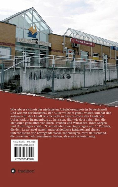 Wie lebt es sich mit der niedrigsten Arbeitslosenquote in Deutschland? Und wie mit der höchsten? Der Autor wollte es genau wissen und hat sich aufgemacht, den Landkreis Eichstätt sowie den Landkreis Uckermark zu bereisen. Denn die beiden Regionen bilden mit 1,3 beziehungsweise 15,2 Prozent Arbeitslosenquote die Spitze und das Schlusslicht in den Statistiken der Bundesagentur für Arbeit. Kein Zweifel: Es gibt rund ein Vierteljahrhundert nach Mauerfall und Wiedervereinigung in diesem Sinne noch immer zwei Deutschland. Eins mit viel und eins mit wenig Arbeit.