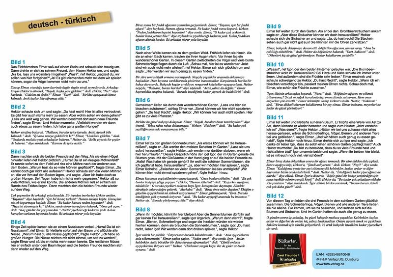 Bildkarten der Bilderbuchgeschichte "Zwei Freunde" für das Kamishibai-Theater in deutsch/türkisch - 13 Bildkarten im DINA3 - Format (29,7 x 42,0 cm), auf festem 300g-Bilderdruck - farbig illustriert - passend für das Kamishibai-Theater - in praktischer DINA3-Tasche zur Aufbewahrung - ideal zur Sprachförderung - kompletter Text auf separater Seite zum Vorlesen - ideale Ergänzung zum Kniebuch Die Bildkarten eignen sich mit ihrem spielerischen Ansatz und der Verbindung vom Zuhören und Sehen perfekt für die Sprachförderung in der Kita oder zum Zweitspracherwerb.. Die Bildkarten werden in das Kamishibai gesteckt und beim Vorlesen des Textes ausgewechselt. Danach können sie auch im Gruppenzimmer aufgehängt werden, um weitere Aktionen zu gestalten. Thema Streit: Das Eichhörnchen Elmar und der Hase Hektor sind traurig. Dort, wo sie leben, ist alles einsam und vertrocknet. Es gibt auch nichts mehr zu essen. Also beschließen die beiden Freunde sich ein neues Zuhause und neue Freunde zu suchen. Aber wohin können sie gehen? NEU - Jetzt auch als KNIEBUCH erhältlich! Alle Kamishibais und Kniebücher sind in 27 verschiedenen Sprachen erhältlich: