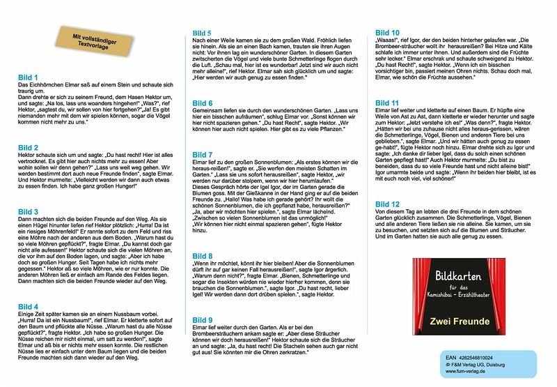 Bildkarten der Bilderbuchgeschichte "Zwei Freunde" für das Kamishibai-Theater - 13 Bildkarten im DINA3 - Format (29,7 x 42,0 cm), auf festem 300g-Bilderdruck - farbig illustriert - passend für das Kamishibai-Theater - in praktischer DINA3-Tasche zur Aufbewahrung - ideal zur Sprachförderung - kompletter Text auf separater Seite zum Vorlesen - ideale Ergänzung zum Kniebuch Die Bildkarten eignen sich mit ihrem spielerischen Ansatz und der Verbindung vom Zuhören und Sehen perfekt für die Sprachförderung in der Kita oder zum Zweitspracherwerb.. Die Bildkarten werden in das Kamishibai gesteckt und beim Vorlesen des Textes ausgewechselt. Danach können sie auch im Gruppenzimmer aufgehängt werden, um weitere Aktionen zu gestalten. Thema Streit: Das Eichhörnchen Elmar und der Hase Hektor sind traurig. Dort, wo sie leben, ist alles einsam und vertrocknet. Es gibt auch nichts mehr zu essen. Also beschließen die beiden Freunde sich ein neues Zuhause und neue Freunde zu suchen. Aber wohin können sie gehen? NEU - Jetzt auch als KNIEBUCH erhältlich! Alle Kamishibais und Kniebücher sind in 27 verschiedenen Sprachen erhältlich: