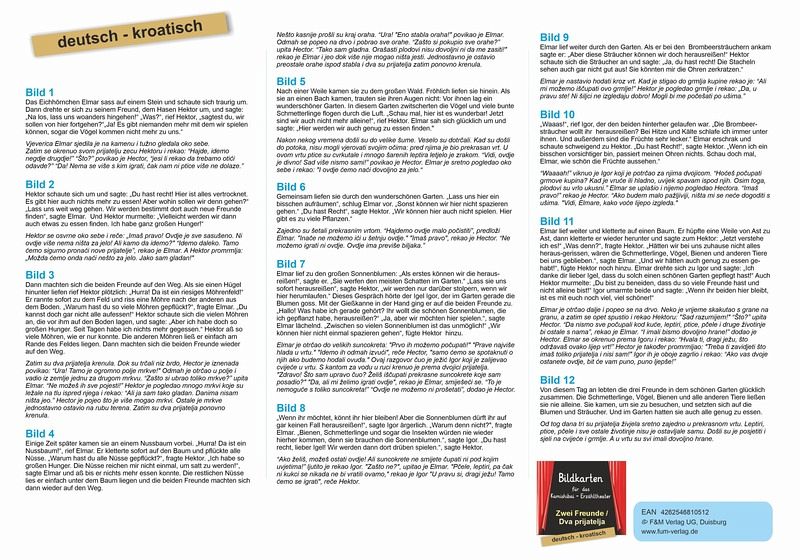 Bildkarten der Bilderbuchgeschichte "Zwei Freunde" für das Kamishibai-Theater in deutsch/kroatisch - 13 Bildkarten im DINA3 - Format (29,7 x 42,0 cm), auf festem 300g-Bilderdruck - farbig illustriert - passend für das Kamishibai-Theater - in praktischer DINA3-Tasche zur Aufbewahrung - ideal zur Sprachförderung - kompletter Text auf separater Seite zum Vorlesen - ideale Ergänzung zum Kniebuch Die Bildkarten eignen sich mit ihrem spielerischen Ansatz und der Verbindung vom Zuhören und Sehen perfekt für die Sprachförderung in der Kita oder zum Zweitspracherwerb.. Die Bildkarten werden in das Kamishibai gesteckt und beim Vorlesen des Textes ausgewechselt. Danach können sie auch im Gruppenzimmer aufgehängt werden, um weitere Aktionen zu gestalten. Thema Streit: Das Eichhörnchen Elmar und der Hase Hektor sind traurig. Dort, wo sie leben, ist alles einsam und vertrocknet. Es gibt auch nichts mehr zu essen. Also beschließen die beiden Freunde sich ein neues Zuhause und neue Freunde zu suchen. Aber wohin können sie gehen? NEU - Jetzt auch als KNIEBUCH erhältlich! Alle Kamishibais und Kniebücher sind in 27 verschiedenen Sprachen erhältlich: