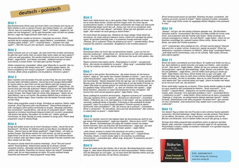 Bildkarten der Bilderbuchgeschichte "Zwei Freunde" für das Kamishibai-Theater in deutsch/polnisch - 13 Bildkarten im DINA3 - Format (29,7 x 42,0 cm), auf festem 300g-Bilderdruck - farbig illustriert - passend für das Kamishibai-Theater - in praktischer DINA3-Tasche zur Aufbewahrung - ideal zur Sprachförderung - kompletter Text auf separater Seite zum Vorlesen - ideale Ergänzung zum Kniebuch Die Bildkarten eignen sich mit ihrem spielerischen Ansatz und der Verbindung vom Zuhören und Sehen perfekt für die Sprachförderung in der Kita oder zum Zweitspracherwerb.. Die Bildkarten werden in das Kamishibai gesteckt und beim Vorlesen des Textes ausgewechselt. Danach können sie auch im Gruppenzimmer aufgehängt werden, um weitere Aktionen zu gestalten. Thema Streit: Das Eichhörnchen Elmar und der Hase Hektor sind traurig. Dort, wo sie leben, ist alles einsam und vertrocknet. Es gibt auch nichts mehr zu essen. Also beschließen die beiden Freunde sich ein neues Zuhause und neue Freunde zu suchen. Aber wohin können sie gehen? NEU - Jetzt auch als KNIEBUCH erhältlich! Alle Kamishibais und Kniebücher sind in 27 verschiedenen Sprachen erhältlich: