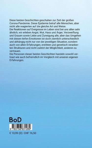 Diese beiden Geschichten geschahen zur Zeit der großen Corona-Pandemie. Diese Epidemie betraf alle Menschen, aber nicht alle reagierten auf die gleiche Art und Weise.Die Reaktionen auf Ereignisse im Leben sind bei uns allen sehr ähnlich, wir erleben Angst, Wut, Hass und Ärger, Verzweiflung und Grauen sowie Liebe und Zuneigung alle, aber das Umgehen mit diesen tiefen Emotionen ist doch ziemlich unterschiedlich und abhängig nicht nur von der jeweiligen Situation, sondern auch von alten Erfahrungen, ererbten und genetisch verankerten Strukturen und nicht zuletzt der Möglichkeit, anderen zu vertrauen.Die Personen dieser beiden Geschichten handeln sowohl vertraut wie auch befremdlich im Vergleich mit unseren eigenen Erfahrungen.