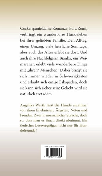 Cockerspanieldame Romanze, kurz Romi, verbringt ein wunderbares Hundeleben bei ihrer geliebten Familie. Den Alltag, einen Umzug, viele herrliche Sonntage, aber auch das Alter erlebt sie dort. Und auch ihre Nachfolgerin Bianka, ein Weimaraner, erlebt viele wunderbare Dinge mit "ihren" Menschen! Dabei bringt sie sich immer wieder in Schwierigkeiten und erlaubt sich einige Eskapaden, doch sie kann sich sicher sein: Geliebt wird sie natürlich trotzdem.Angelika Werth lässt die Hunde erzählen: von ihren Erlebnissen, Ängsten, Nöten und Freuden. Zwar in menschlicher Sprache, doch so, dass man es ihnen direkt abnimmt. Ein tierisches Lesevergnügen nicht nur für Hundefreunde!