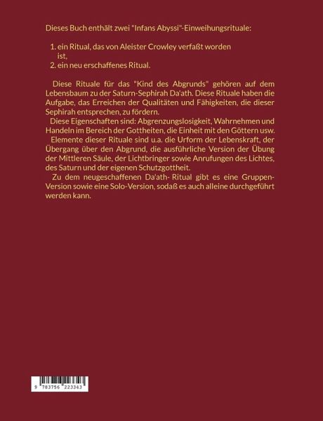 Dieses Buch enthält zwei "Infans Abyssi"-Einweihungsrituale: 1. ein Ritual, das von Aleister Crowley verfaßt worden ist, 2. ein neu erschaffenes Ritual. Diese Rituale für das "Kind des Abgrunds"gehören auf dem Lebensbaum zu der Saturn-Sephirah Da'ath. Diese Rituale haben die Aufgabe, das Erreichen der Qualitäten und Fähigkeiten, die dieser Sephirah entsprechen, zu fördern. Diese Eigenschaften sind: Abgrenzungslosigkeit, Wahrnehmen und Handeln im Bereich der Gottheiten, die Einheit mit den Göttern usw. Elemente dieser Rituale sind u.a. die Urform der Lebenskraft, der Übergang über den Abgrund, die ausführliche Version der Übung der Mittleren Säule, der Lichtbringer sowie Anrufungen des Lichtes, des Saturn und der eigenen Schutzgottheit. Zu dem neugeschaffenen Da'ath-Ritual gibt es eine Gruppen-Version sowie eine Solo-Version, sodaß es auch alleine durchgeführt werden kann.