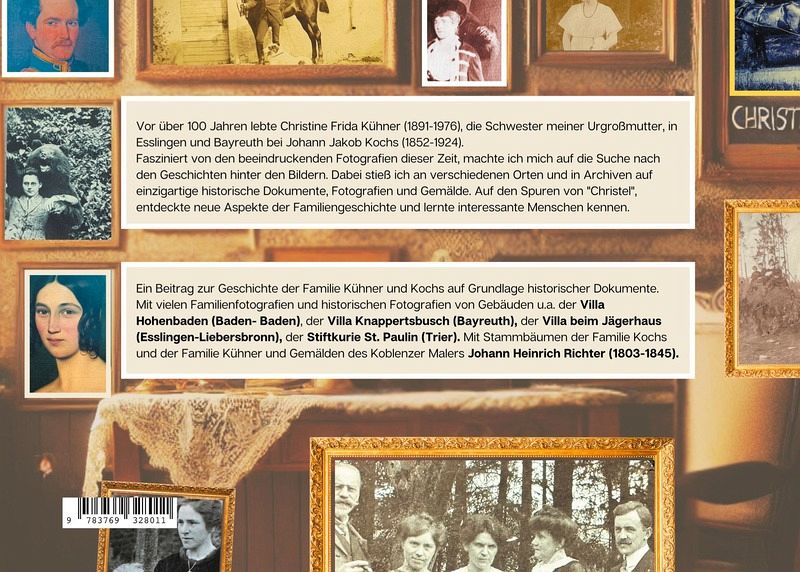 Vor über 100 Jahren lebte Christine Frida Kühner, die Schwester meiner Urgroßmutter, in Esslingen und Bayreuth bei Jakob Kochs. Ihre Fotografien und die Geschichten, die sich dahinter verbergen, wurden zu meiner Inspiration. Sie motivierten mich, ein Jahr lang den Spuren meiner Vorfahren zu folgen. Ich tauchte tief in die Vergangenheit ein, recherchierte in verschiedenen Archiven und suchte den Kontakt zu Familienmitgliedern. Dabei sammelte ich Fotografien, Dokumente und Erinnerungen, die neue Einblicke in das Leben meiner Vorfahren ermöglichten. Diese Reise führte mich nicht nur zu faszinierenden Familiengeschichten, sondern auch zu historischen Ereignissen und interessanten Orten, die in diesem Buch dokumentiert sind. Die Kombination aus Bildern und Berichten lädt ein, in die Vergangenheit einzutauchen und die Verbindung zwischen persönlicher und allgemeiner Geschichte neu zu entdecken.