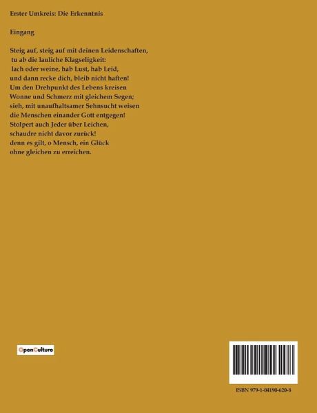 Erster Umkreis: Die Erkenntnis Eingang Steig auf, steig auf mit deinen Leidenschaften, tu ab die lauliche Klagseligkeit: lach oder weine, hab Lust, hab Leid, und dann recke dich, bleib nicht haften! Um den Drehpunkt des Lebens kreisen Wonne und Schmerz mit gleichem Segen; sieh, mit unaufhaltsamer Sehnsucht weisen die Menschen einander Gott entgegen! Stolpert auch Jeder über Leichen, schaudre nicht davor zurück! denn es gilt, o Mensch, ein Glück ohne gleichen zu erreichen.